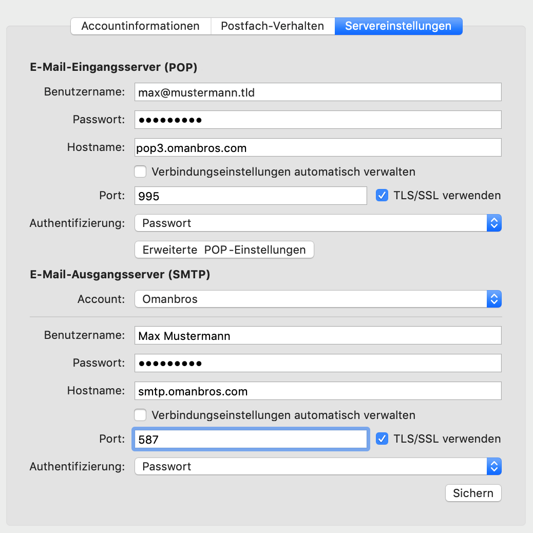 Im nächsten Schritt wechseln Sie zu der Registerkarte Servereinstellungen und ergänzen Sie die fehlenden Felder so wie im nächsten Bild und klicken Sie auf → sichern.